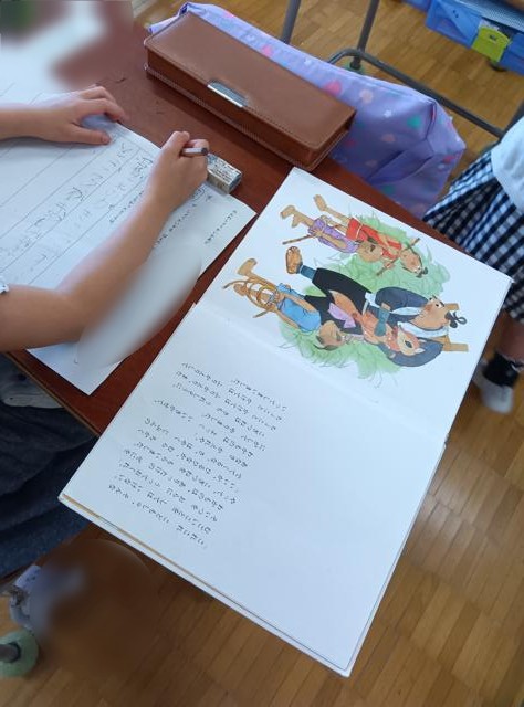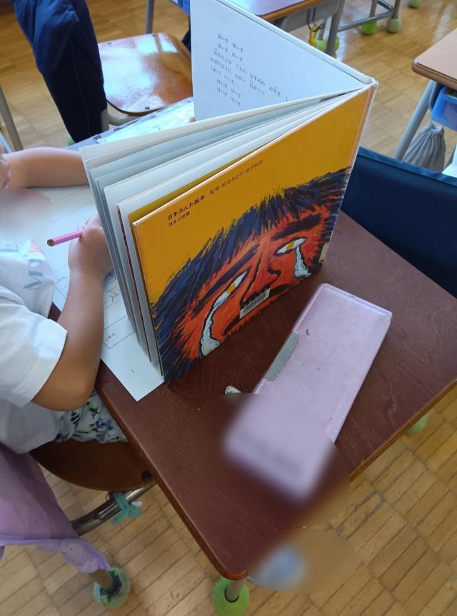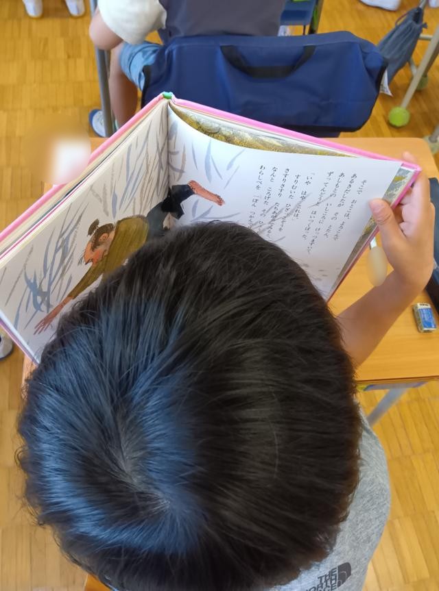 日本語で「民話」に触れた1年生、図書の時間にもたくさんの子が民話を読んでいました。
