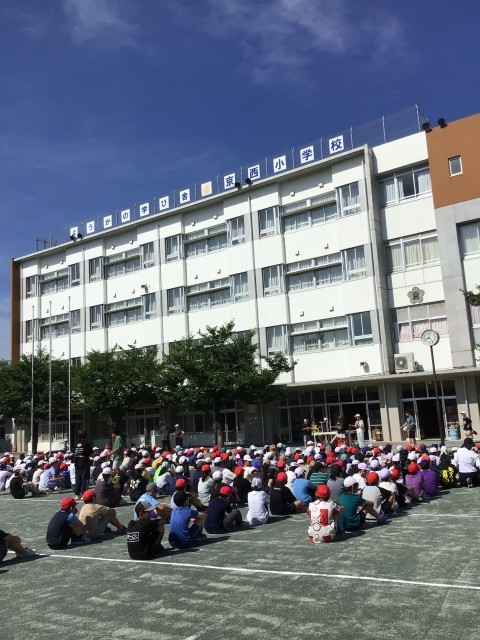 1〜3年生は体育館で、4〜6年生は校庭に集まって行いました。