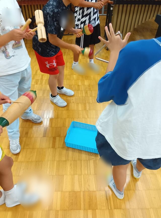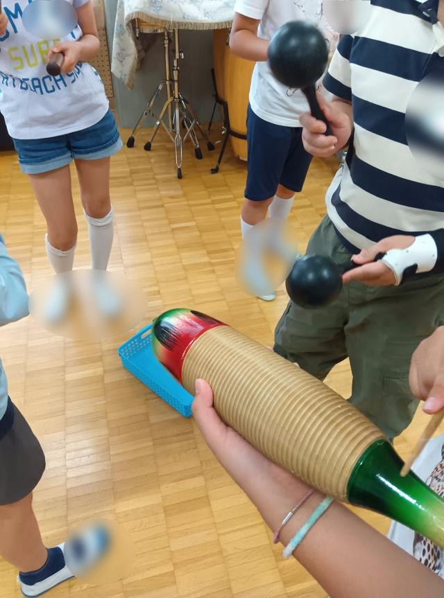 曲名は分かりませんが、5つの打楽器で、ここは南国かと錯覚させる(確かに外は暑いけど)音を奏でます。グループの中で、楽器を変えながら、順に様々な楽器を経験できるようにローテーションしていました。大きな子がいるなと思ったら、イングリッシュウィークで音楽の時間にこの学級に入っていた先生でした。先生も一緒に、全員でもやってみました。これだけの数でやると迫力がありますね。ブラボーです。