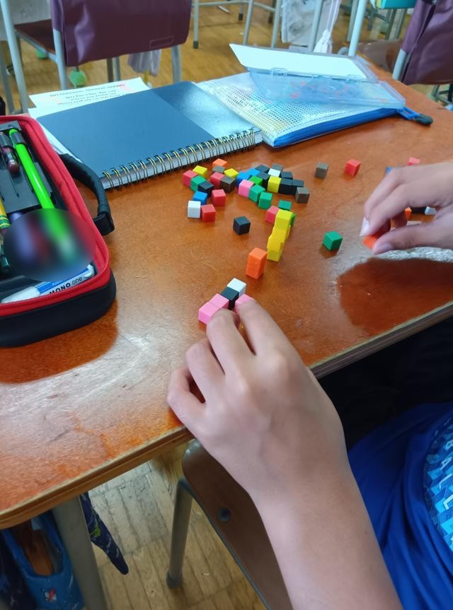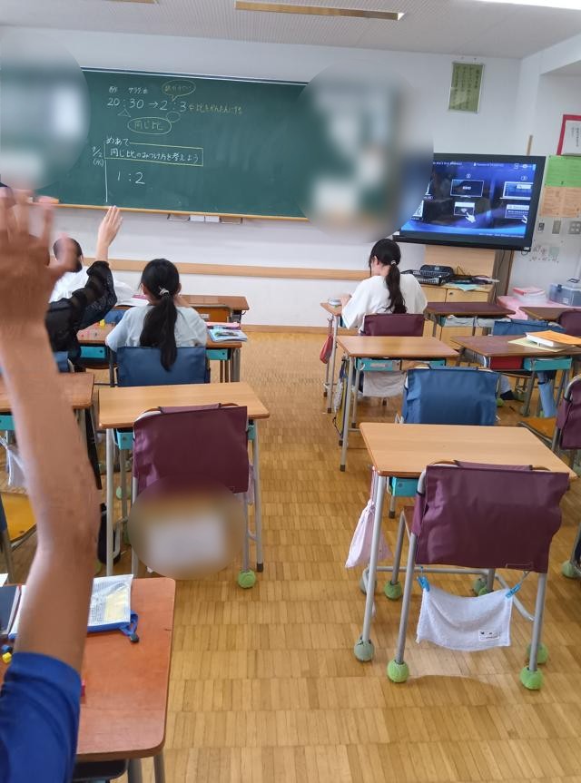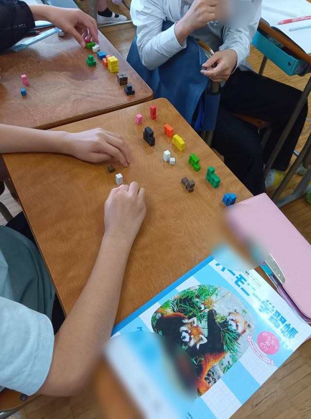 算数は、習熟度別で行っていますので、他の学級では、立方体のブロックを使って比の考え方を捉えようとしています。半具体物を使ったこのやり方の方が分かりやすい、その学級の子どもたちに合っているとの判断からだと思います。子どもに合わせて、やり方を柔軟に変えながら、一番伝わりやすい方法を工夫しています。