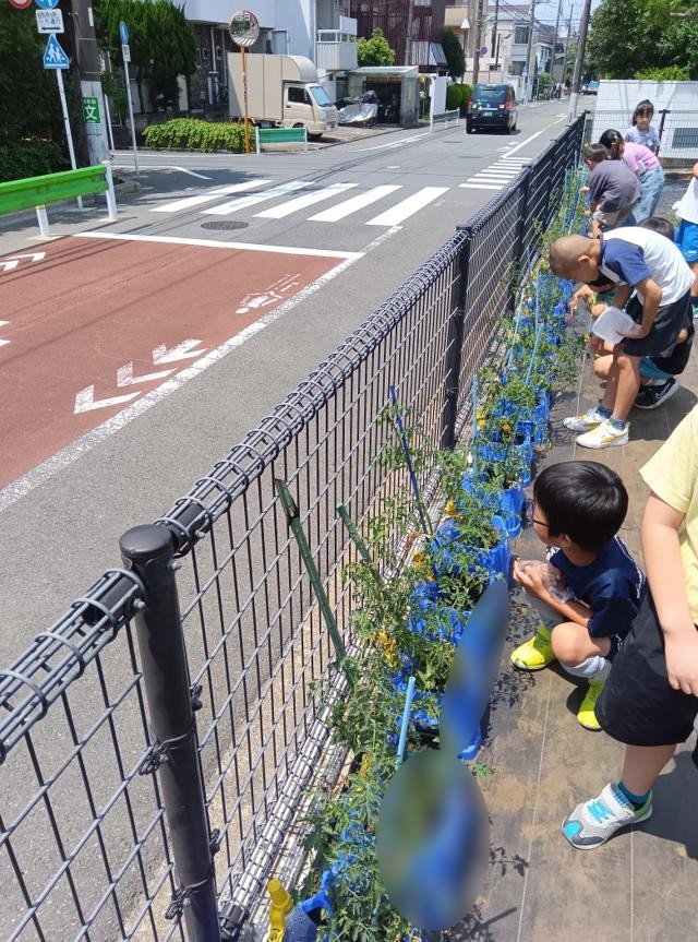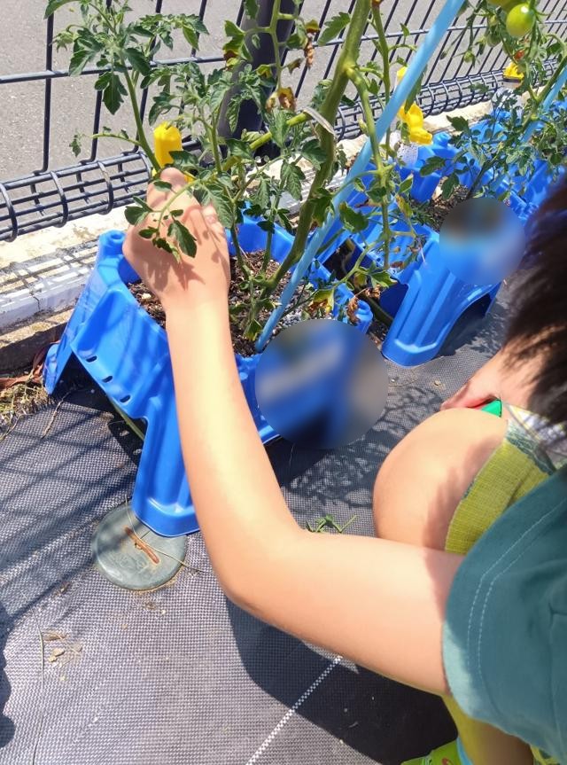 ミニトマトがたくさん実をつけ、赤くなっているものもたくさんありました。みんなで育てている他の野菜もまだ収穫はできないものの、花が咲いた後にしっかり実を付けています。