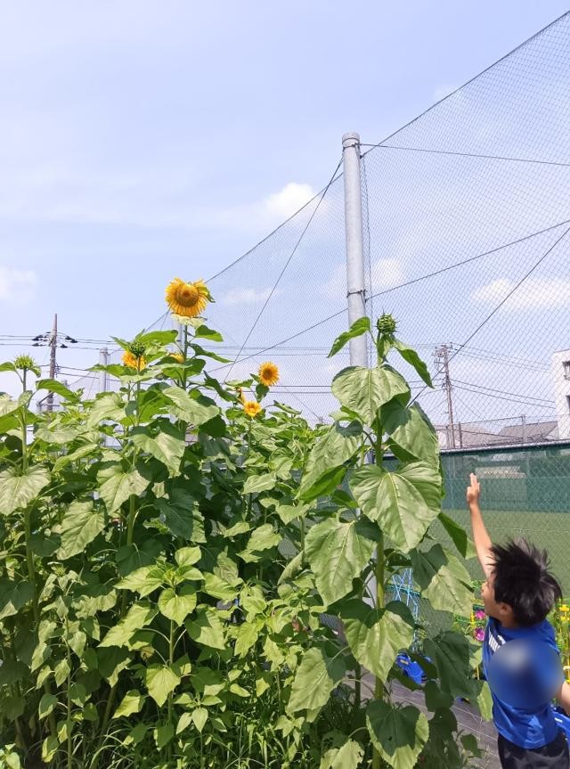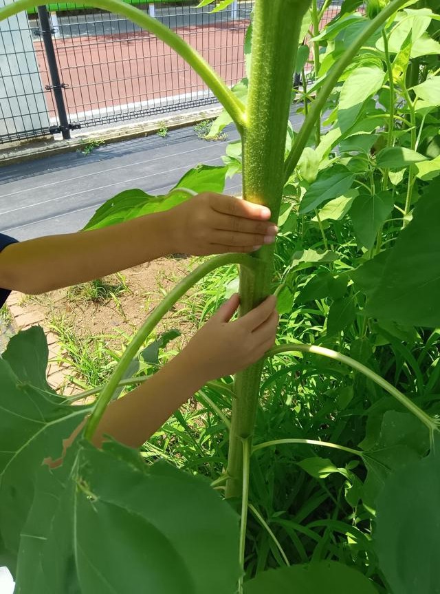 フラワーランドには、例の大きなひまわりもあります。2年生がジャンプしてもまったく届かない位置で子どもたちを見守るひまわりの花。葉の大きさも尋常ではありません。葉と比べているのは、私の手です。子どもの手ならもっと大きさを感じられたかもしれません。茎をつかんでいるのは子どもたちの手です。もはや「木」ですね。