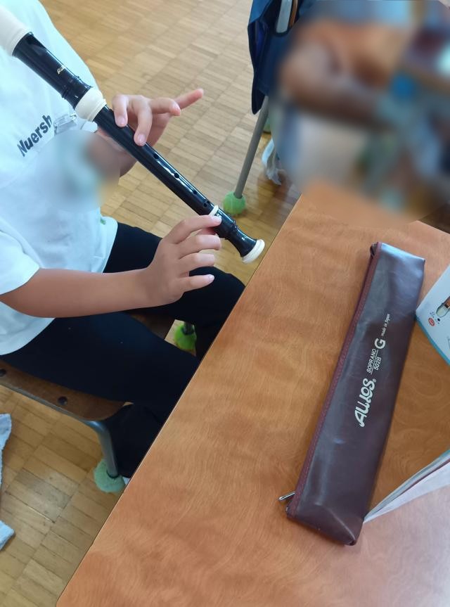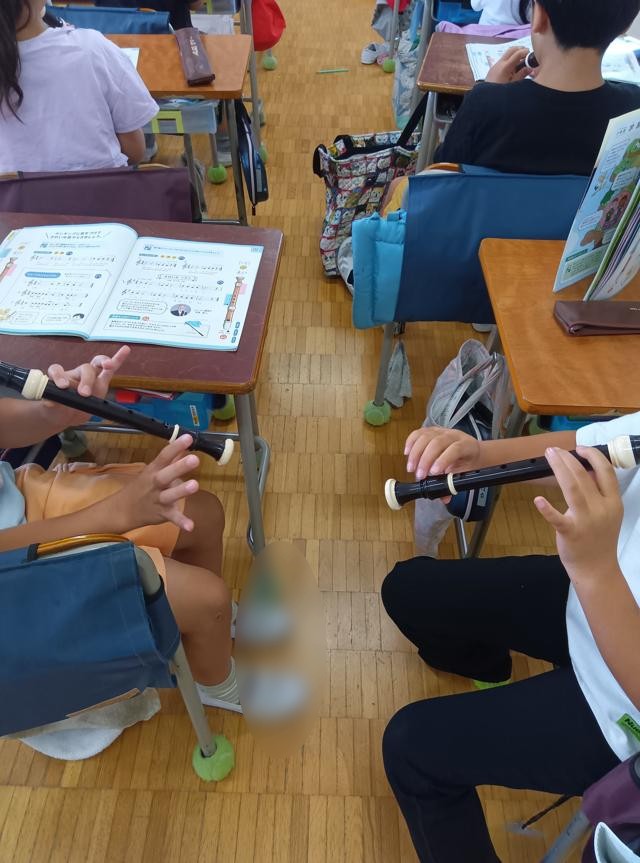 交代で吹いたり、向かい合って拭いたりしながら、友達とお互いに指使いを確認していました。色々な長さや組み合わせで、「シ」と「ラ」が出てきて、伴奏に合わせて、二音でこんなに豊かな表現ができるのかというくらいすてきな曲になっていました。もしかしたら、この前に一音の曲もあったかもしれません。