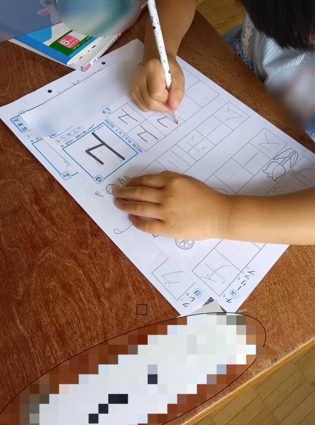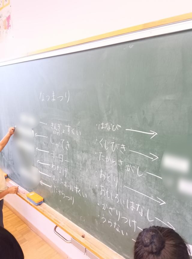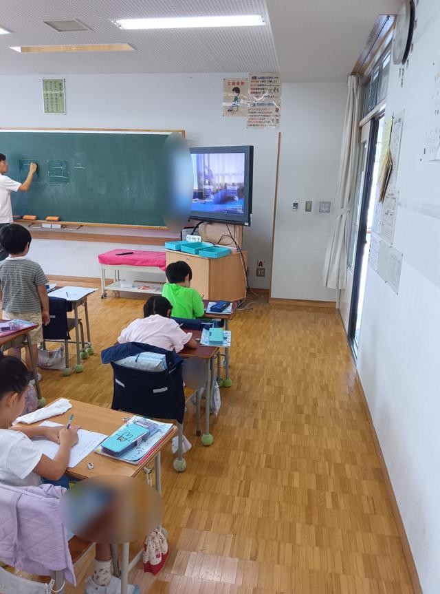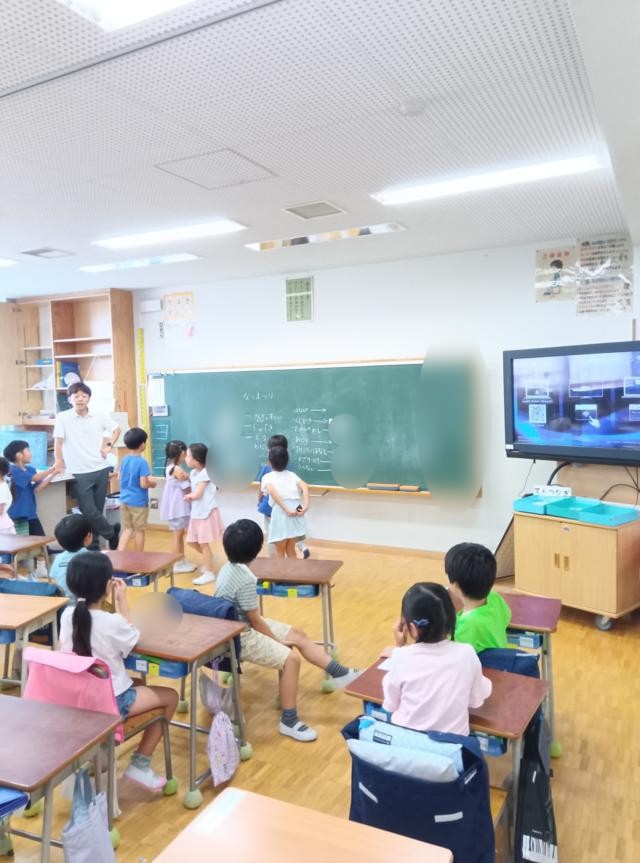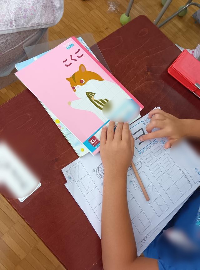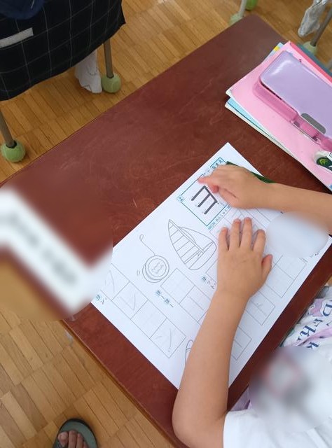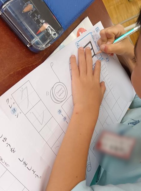 どの部屋から始まって、どの部屋へ進むのか、形を確認していました。その後、みんなで空書きをしたり、お手本の大きな字を指でなぞったりしていきます。丁寧に、丁寧に。片仮名の学習ももう少しで終わります。平仮名、片仮名、たくさんの文字を学習した1学期でした。文字の知識が増えるとともに、知っている言葉もたくさん増えたのではないかと思います。2学期からはいよいよ漢字の学習もスタートします。