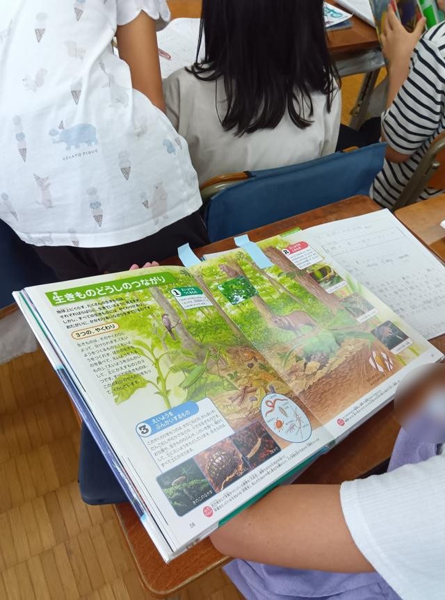 6年生の理科「生物と地球環境」の学習です。この単元では、新たな学習をしたり、実験をしたりというわけではありません。これまでに学習した動物や植物の体のしくみの学習などの知識を生かして、地球環境についての考えを深めていきます。それを通して生物と環境の関わり、特に水や空気、食べ物との関係、そして人の生活と環境の関係について学びます。