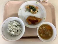 今日の給食わかめごはん牛乳魚のフライ メルルーサ油揚げと野菜の酢みそあえすまし汁...