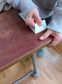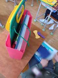 1年生は、机の左側に貼られた名前のシールをはがしていました。机に名前シールを貼っ...