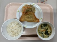 今日の給食麦ごはん 有機米牛乳ツナジャンボぎょうざ春雨の野菜炒めたまごとわかめの...