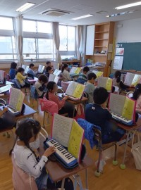 1年生の音楽は鍵盤ハーモニカの練習中でした。「おどるポンポコリン」です。まずは息...