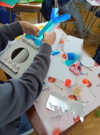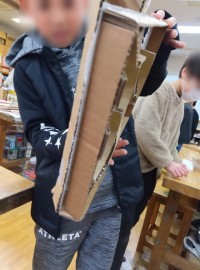 3年生の図工「みんなでオン・ステージ」、ギターを作っています。まずは基本の形をみ...