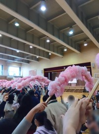 6年生を送る会が行われました。4年生が持つ花のアーチの準備が整い、6年生が入場し...
