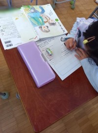 1年生が漢字テストの直しをしていました。1年間のまとめの漢字テストのようです。そ...