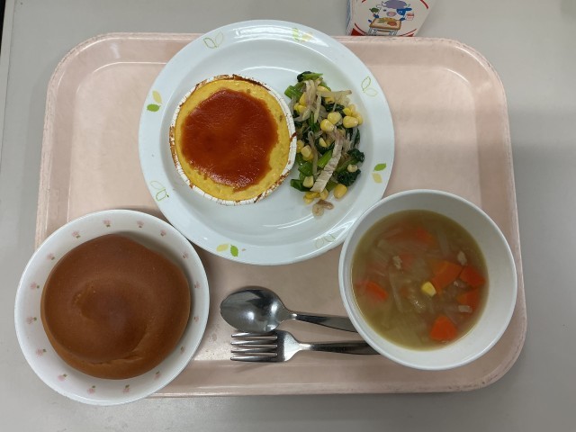 今日の給食黒砂糖パン牛乳スペイン風オムレツ青菜のサラダABCスープ産地情報じゃが...