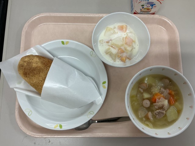 今日の給食きなこ揚げパン牛乳ポトフフルーツヨーグルト産地情報にんじん 徳島たまね...