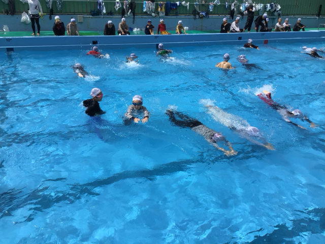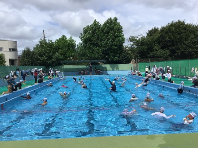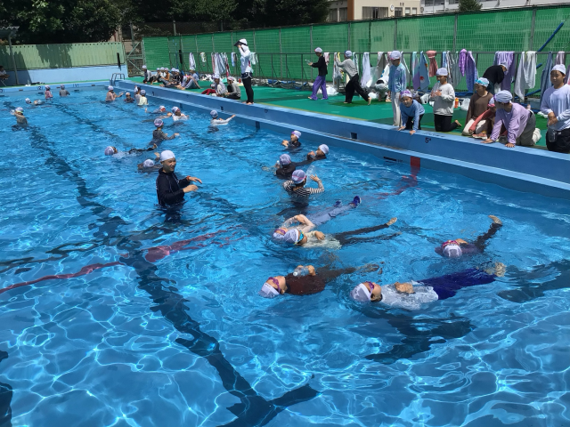 17日に着衣水泳を行い、自分や周りの人の命を水難事故から守る方法を学習しました。実際に服を着たまま入水すると、想像よりも体が動かしにくいことを体験したり、事故にあった際はペットボトルなど身近な浮くものを使うと溺れないことを学んだりしました。