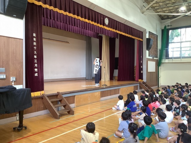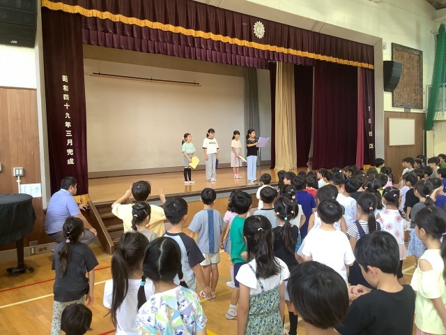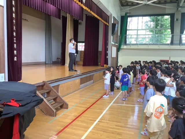 「1学期が長かったと感じた人?あっという間に感じた人?」と校長先生が聞くと、あっという間の方に手を挙げる子どもたちが多かったです。それだけ充実していたことが伝わってきました。校長先生からは「誰かと比べる必要はなく自分自身が頑張ることが大切」「事故なく気を付けて過ごすこと」「夏休みだからできることに挑戦してほしい」とお話がありました。