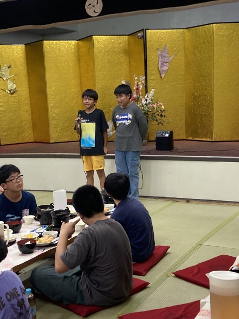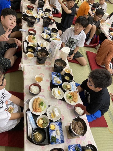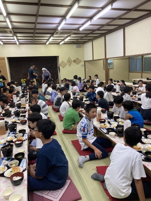 1日目 夕食。待ちに待った夕食の時間です。地元の美味しい食材が並びました。和やかに、美味しくいただきました。