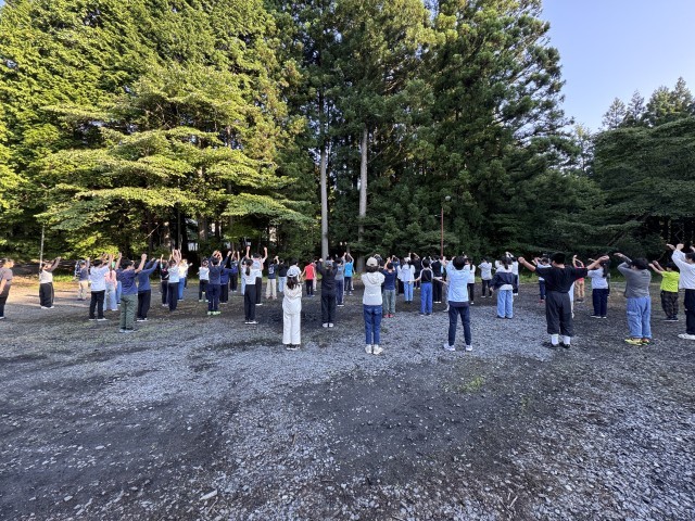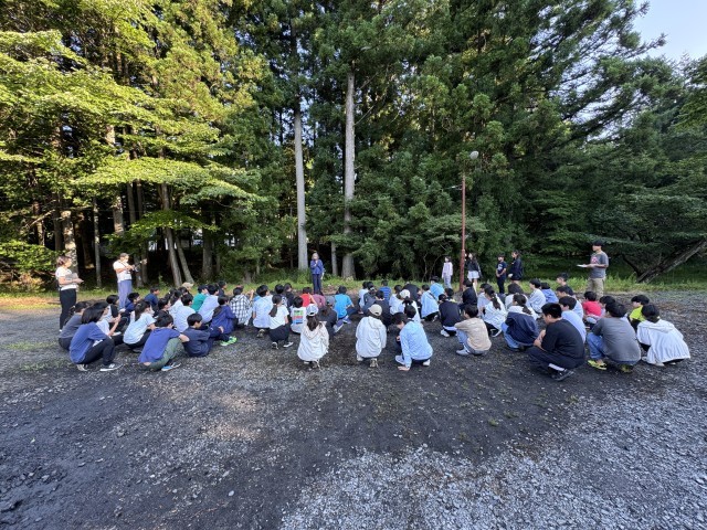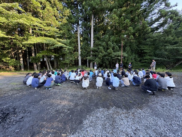 おはようございます。2日前の朝が始まりました。代表児童の言葉では、ハイキングを頑張ることや肝試しを楽しもうという話がありました。朝会の後は朝食が始まります。
