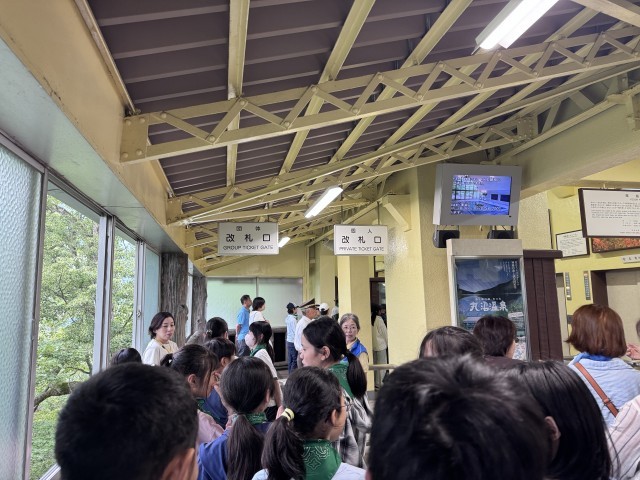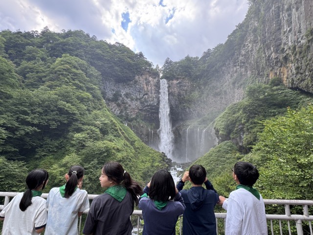 美味しいお昼ご飯とアイスを食べた後はバスで華厳の滝へと向かいました。エレベーターを降りると、そこには大きな滝が!!滝の前でクラスごとに記念撮影をしました。目の前の大きな滝に、子どもたちの歓声が聞こえてきました。この後は宿へ戻り、日光彫り体験をします。