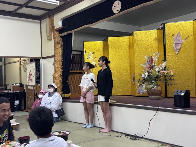 早いもので林間学園最後の夕食となりました。係の児童からは、今日の楽しかったことや夕食で楽しみにしている食べ物、最後なので残さず食べようという話があり、今回もたくさんの児童がご飯やお茶をお代わりしていました。この後はいよいよ肝試しです!!