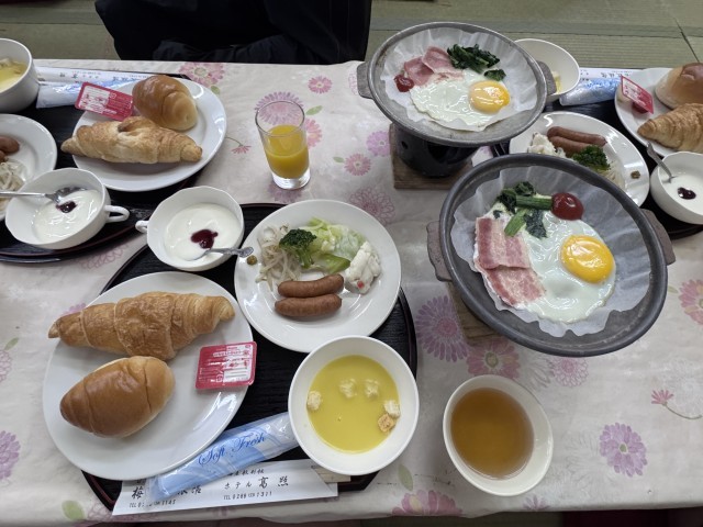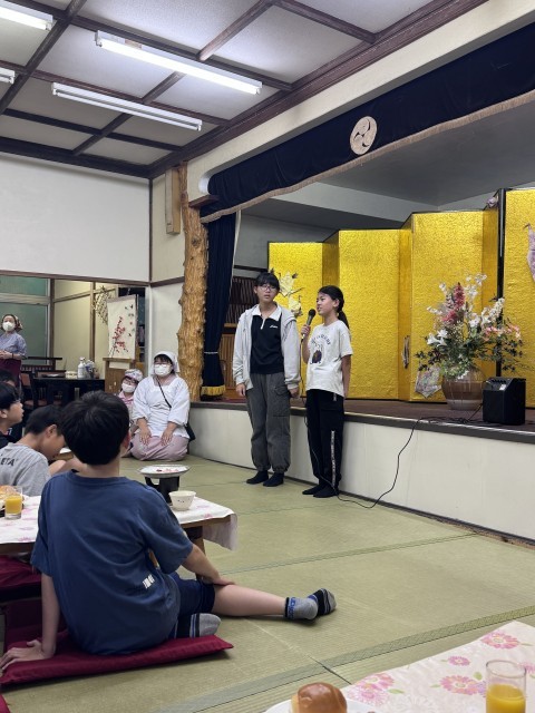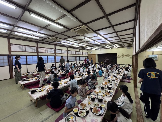 旅館での最後の食事となる朝食が始まりました。良く眠れたようで笑顔で食事をしていたのが印象的でした。この後は部屋の片付けをして閉室式です。時間に間に合うように部屋全員で協力して頑張ります。
