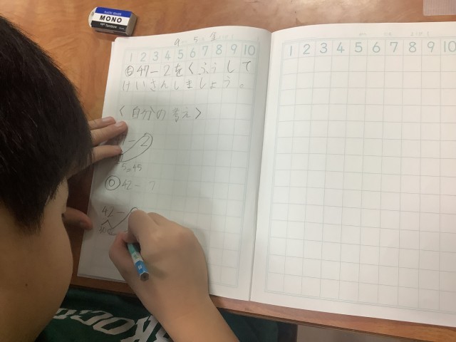 2年生の算数ではひき算の学習をしています。47−2の計算の仕方をもとにして、42−7はどのように計算したらよいか考えました。「42をいくつといくつに分けたら計算できるか」「7を分ける方法もある」と様々な考えが出されました。