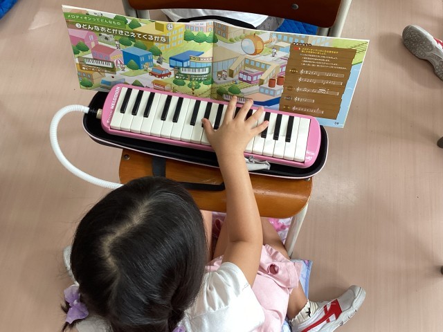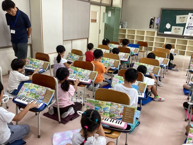 1年生の音楽の学習では、鍵盤ハーモニカを使って学習しています。1学期に学習したことを思い出し、いろいろな音を出してみました。座り方・指の曲げ方を確認して上手に吹くことができました。