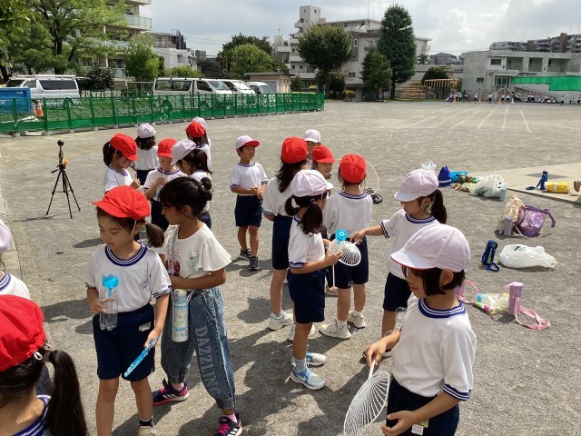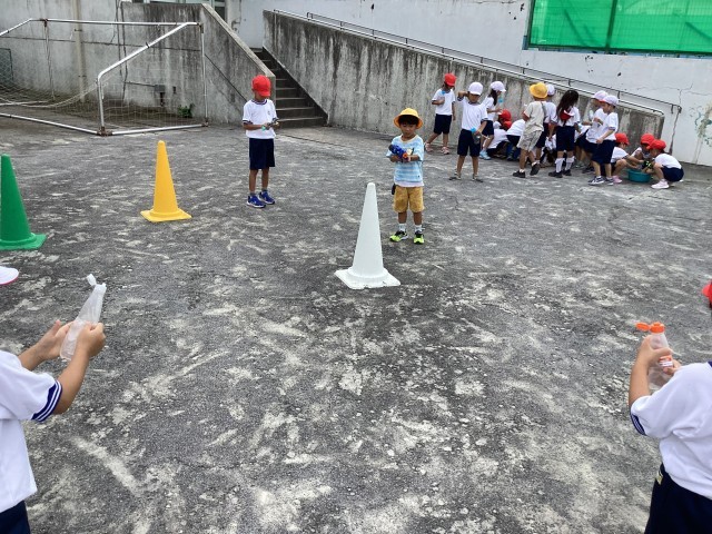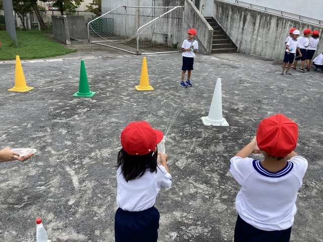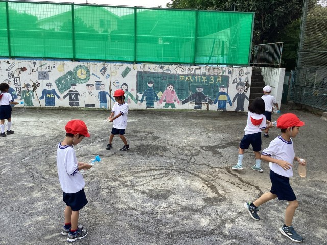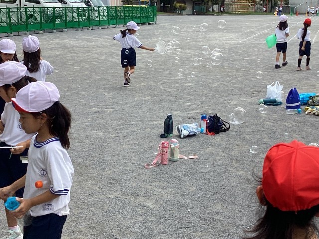 3時間目に1年生合同で「みずであそぼう」を行いました。持ってきたペットボトルやマヨネーズやケチャップの容器を使ってみずとばしをしたり、校庭に絵を描いたりしました。また、ストローやうちわを使ってしゃぼん玉を作りました。道具の準備等、ご協力ありがとうございました。