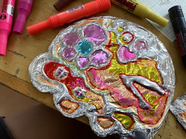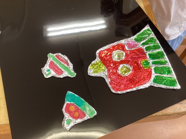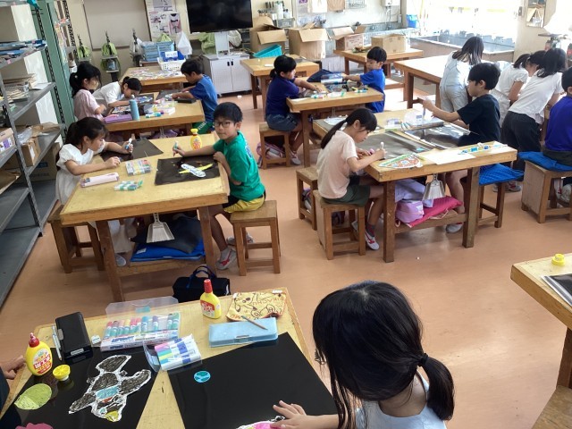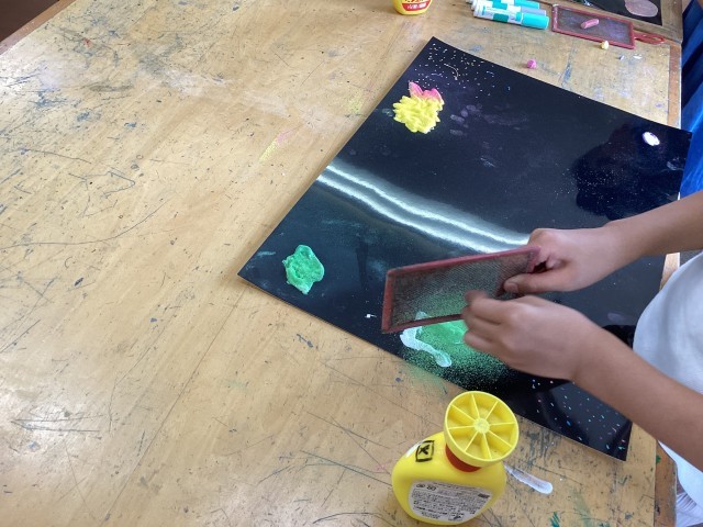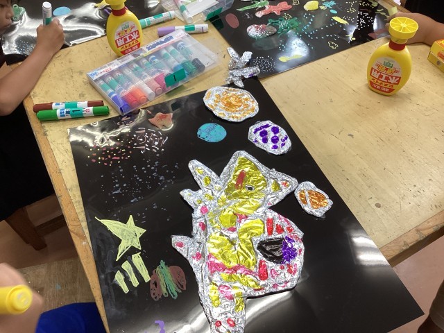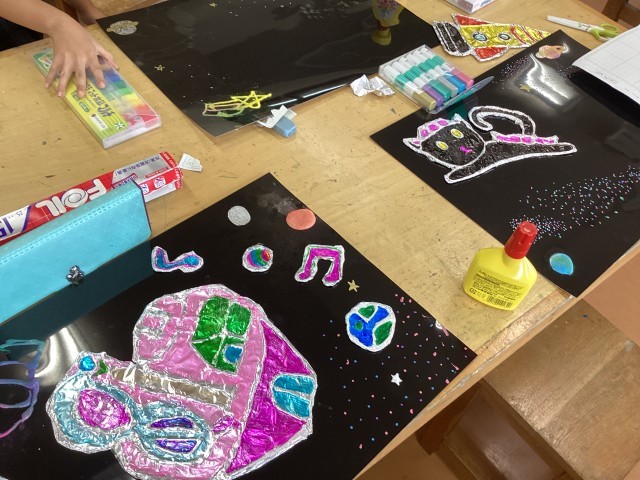 3年生は2学期から展覧会に向けて作品を制作をしています。ボンドを出して固めた紙をアルミホイルで包んだ宇宙船を黒い紙にのせて宇宙を作っています。絵の具、ボンド、ペン、チョークなど様々なものを使っています。