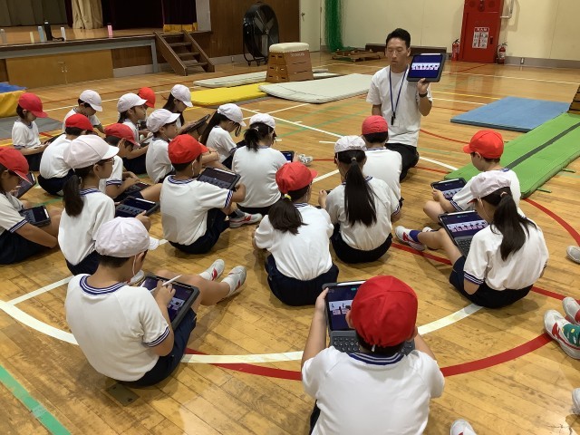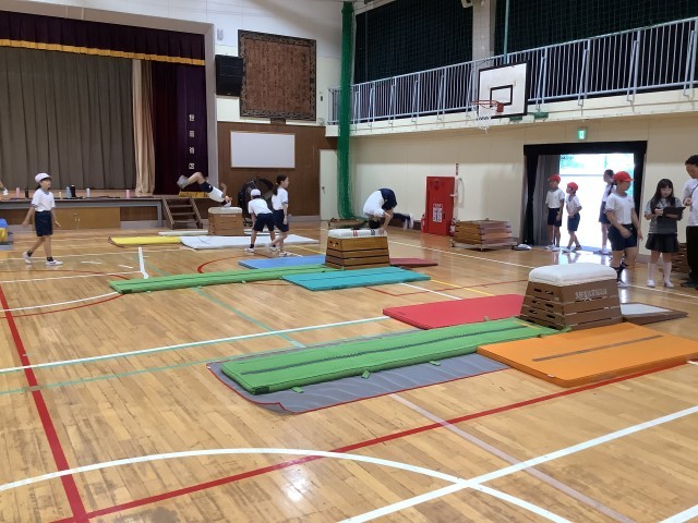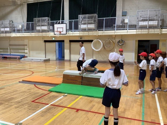 4年生の体育では跳び箱運動をしています。今日は台上前転に挑戦しました。台上前転のポイントをタブレットで確認し、お手本の友達の技を見た後に、それぞれレベルを選んで練習しました。手の位置や背中を丸めることなどポイントを意識していました。たくさん練習して上手に回れる子が増えました。