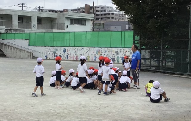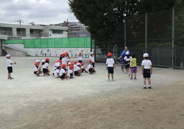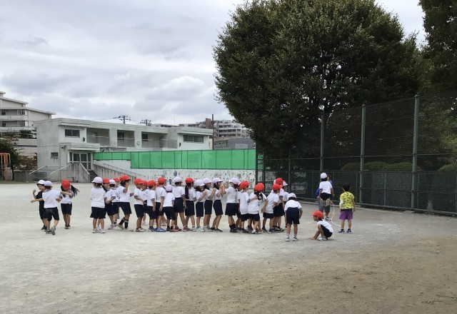 1年生の体育では、大なわとびをしています。今日は、上手に跳べている人の手本を見て、縄に入るタイミングなど友達のいいところを見付けていました。その後、みんなで挑戦し、跳べる人が少しずつ増えてきました。