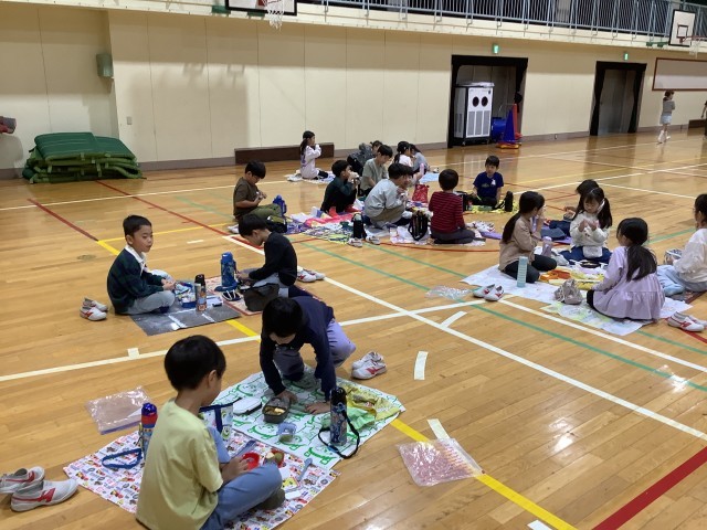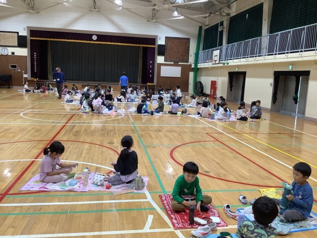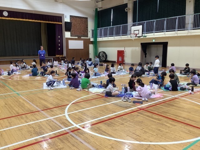 今日は蘆花恒春園への遠足が予定されていましたが、雨のため残念ですが来週に延期となりました。全員が体育館に集まってなかよくお弁当を食べました。「デザートがあるよ!」「かわいいおにぎりでしょ」とお弁当を嬉しそうに見せてくれました。保護者の皆様、おいしいお弁当のご準備ありがとうございました。