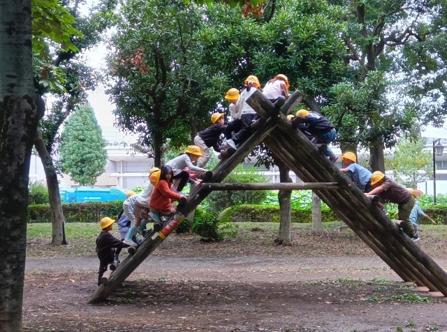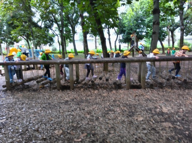 フィールドワークの後は、自由遊びです。アスレチック遊具で遊んだり、どんぐり拾いをしたりしました。順番を守ったり、だるまさんが転んだなどをして遊んだりと、友達と一緒に仲良く過ごしました。