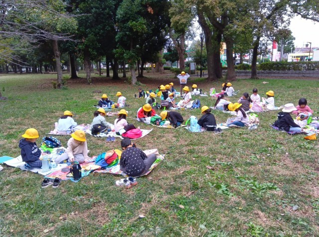 遊んだ後は、各クラスでまとまって、お昼ご飯です。お家の人が作ったお弁当をみて、嬉しそうにしていました。