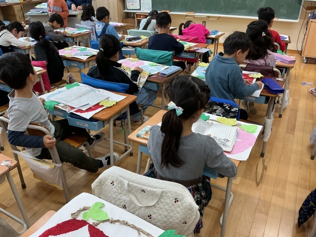 1年生の図工も展覧会に向けてラストスパートです。平面作品と立体作品の仕上げを頑張っていました。「朝顔の和紙が大変だったんだよ」「友達の作った虹色パフェが好きだよ」といろいろ教えてくれました。