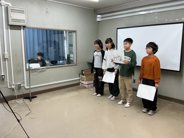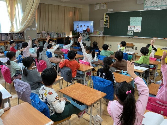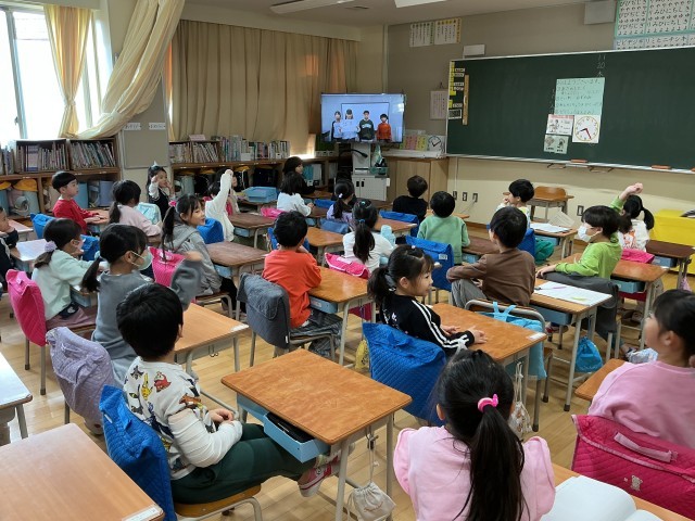 テレビ放送でみんなで楽しく集会がありました。今日のゲームは学校アンケートクイズです。人気の給食のメニューや学習など予想して、3つの選択肢から正解を考えました。1年生も楽しそうに参加して、正解を聞いて大喜びしていました。