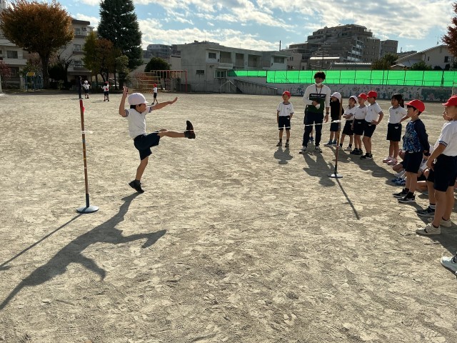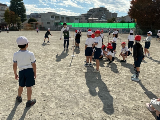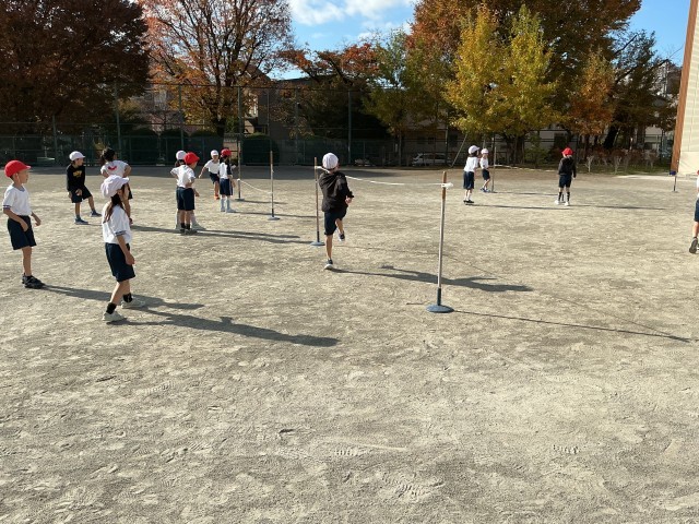 2年生の校庭での体育では、ゴムを使って高跳びをしています。友達のお手本を見て、跳ぶときのポイントをみんなで話し合いました。見付けたポイントを意識しながら自分の高さに挑戦しました。何度も何度も練習したり、友達を「頑張れ!」と応援したりしながら意欲的に取り組んでいました。