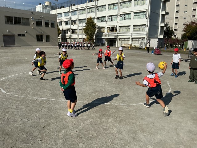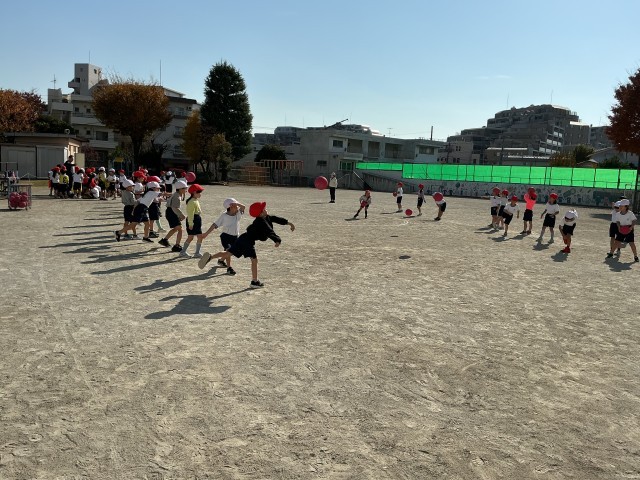 1年生の校庭体育ではボール投げをしています。ボールの投げ方のポイントを先生から教わり、片手で投げる練習をしました。その後は中当てゲームをして、投げたり取ったりする楽しさをいっぱい感じていました。