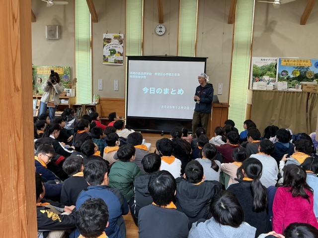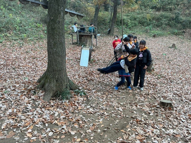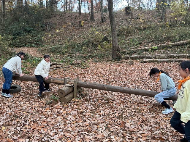 昼食後、アスレチックで遊びました。木で作られているロープのブランコやシーソーなどが珍しく「楽しい!」と言いながら思いっきり友達と遊んでいました。体験後、スタッフの方と振り返りをしました。
