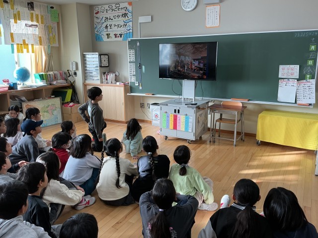 今日はみんなで楽しく集会がありました。画像の中から扮装した集会委員を見付けるゲームでした。どのクラスも、テレビの画面をよく見て探していました。