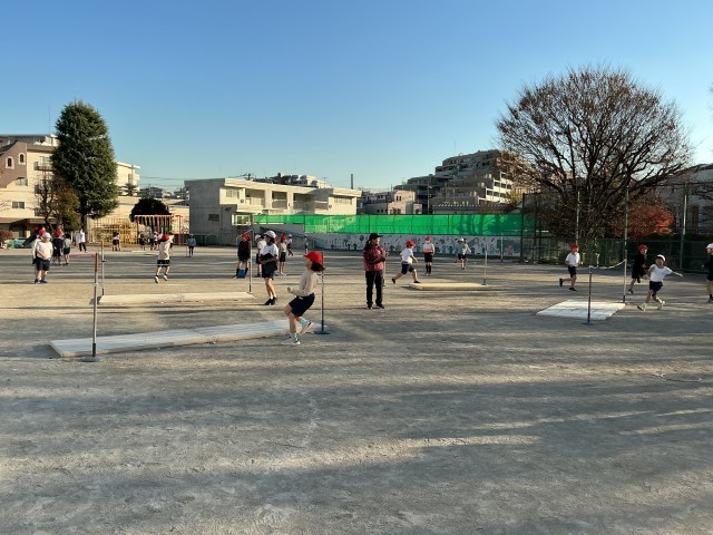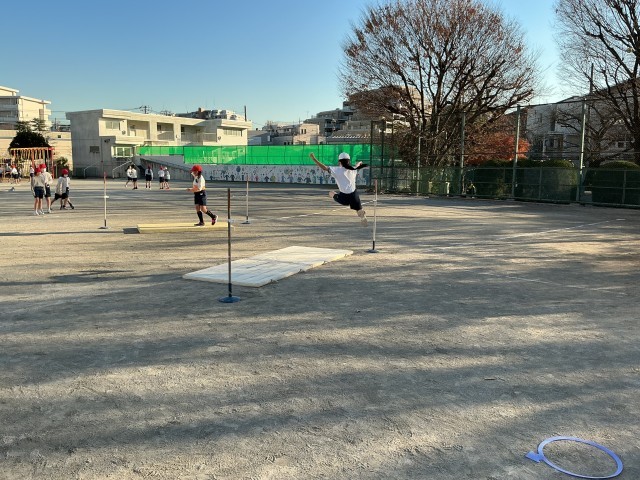 4年生の校庭体育では、走り高跳びをしています。踏切までの歩数や跳びやすい高さを自分で考えて練習しました。きれいなフォームで跳べる子が多く、練習の成果が見られました。