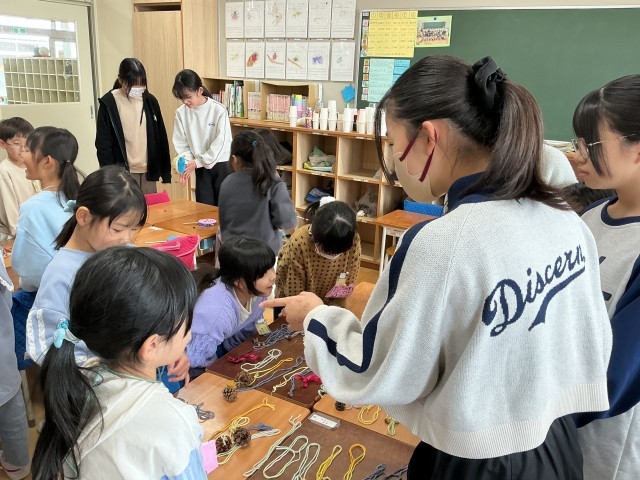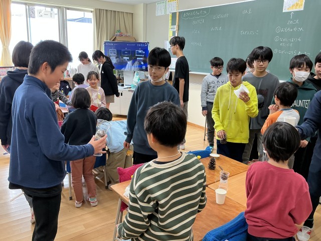 1年生は生活科の学習で、どんぐりや松ぼっくり等の秋に集めた自然のものを使って遊ぶものを作りました。今日は、2年生と6年生を招いて「あきのおもちゃやさん」を開きました。どんぐりごまやでんでん太鼓、けん玉、ペンダント等のお店で、6年生も楽しそうに遊んでいました。5時間目は2年生が遊びに来ます。