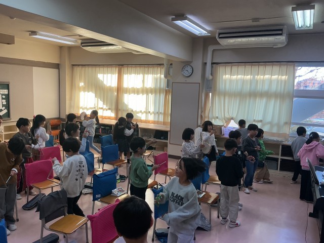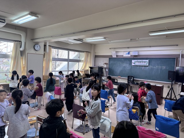 音楽の学習では、思い浮かべた様子に合うように歌い方や楽器の演奏の仕方を工夫したり、様子を思い浮かべながら聞いたりすることを勉強しています。これまでに星空の様子や歌詞の様子を思い浮かべながら歌ってきました。今日はクリスマスが近いこともあり「あわてんぼうのサンタクロース」を歌いました。歌とともにタンバリン・鈴等を使って演奏し、みんなでミニ演奏会をしました。