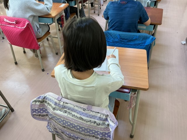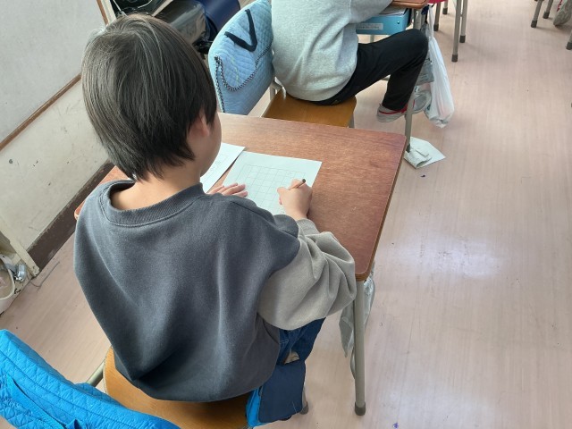 2年生も書き初めの練習をしています。お手本と睨めっこしながら、句読点の位置にも気を付けて丁寧に書いていました。静かな雰囲気の中、集中して一文字一文字丁寧に書きました。