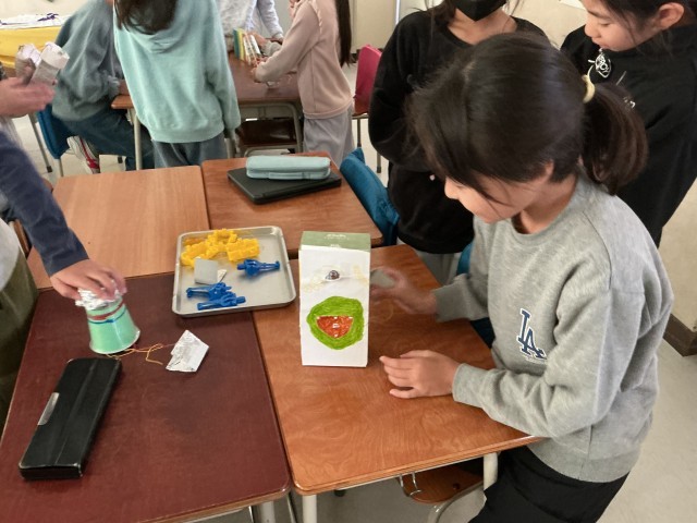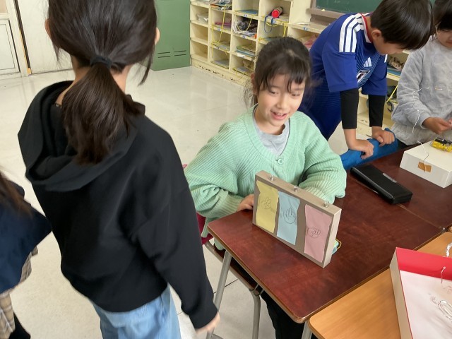 3年生の理科の学習では、学習したことを活かして豆電球を使ったおもちゃ作りをしました。今日はおもちゃを紹介し合って遊びました。ツリーやお化け、じゃんけんゲームなど工夫して作ることができました。どれも楽しいおもちゃです。