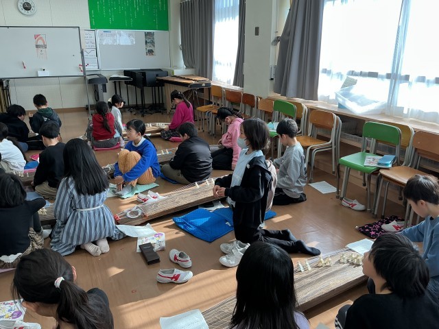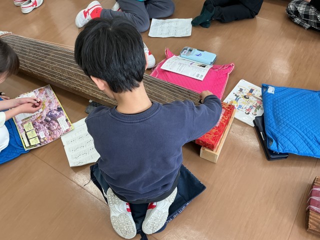 4年生の音楽では箏の演奏に挑戦し、「さくらさくら」をグループで交代して一人ずつ演奏しました。日本に古くから伝わる楽器の音色をみんなで楽しみました。