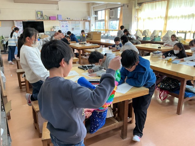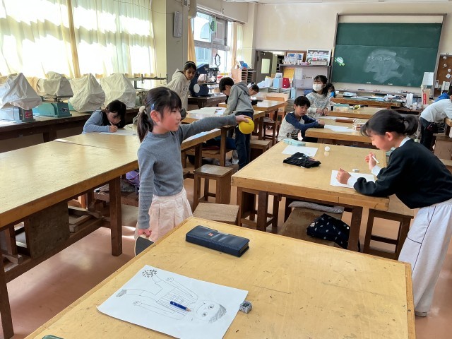 3年生の図工では、夢を叶えた自分の姿を想像して絵に表す学習をしています。今日はラケットやボールなどを友達に持ってもらい、未来の自分の下書きしました。マジシャンになっている自分の姿を想像して、マジックをしている場面を友達に演じてもらっている子もいました。どんな絵になるのか、完成が楽しみです。