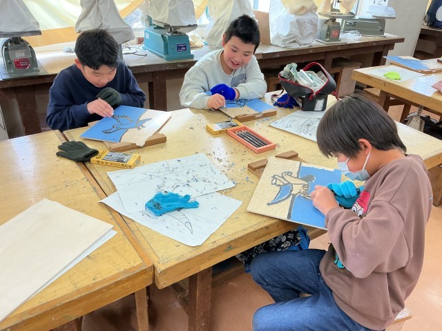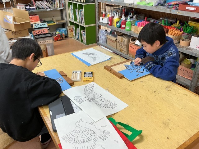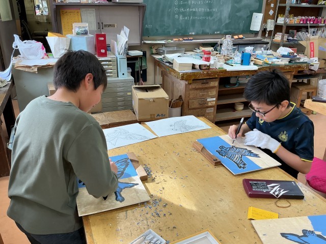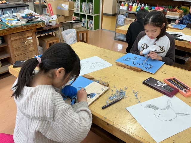 4年生の図工では彫刻刀を使って版画に取り組んでいます。今日は版をつくりました。三角刀と丸刀の特徴を考えて集中して彫っていました。どの子も鳥の絵が上手で、迫力のある版ができていました。刷り上がりが楽しみです。