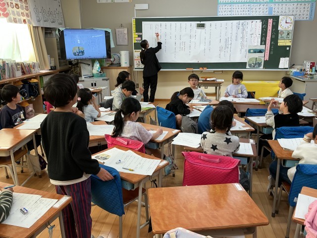 1年生の国語では「たぬきの糸車」を学習しています。今日は2つ目の場面を読んで、たぬきの様子やおかみさんの気持ちを考えました。読み取ったことをもとに、どういう口調で音読したらいいか考えました。考えをワークシートに書き込んでみんなで話し合いました。最後のおかみさんの言葉は、優しい口調がいいことに気付きました。