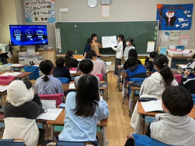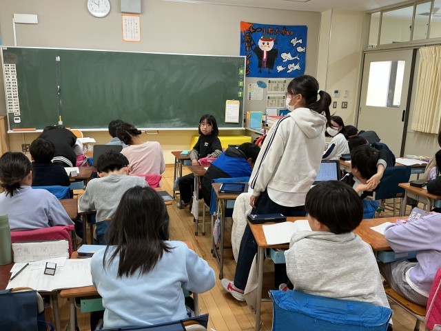 4年生の国語では、調べたことを表やグラフにまとめて分かりやすく発表する学習をしています。今日は、発表し合って互いのグループの良かったところを交流しました。「3分の2の人が〜」「〜は〜人でした」「クラスの半分が〜と分かりました」と事実をもとに、家での過ごし方や習い事などの調べたことを発表できました。